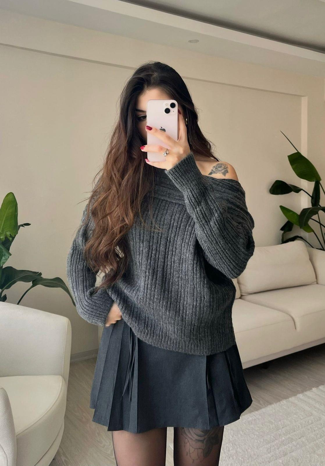 Ashley Kayık Yaka Triko Kazak Antrasit