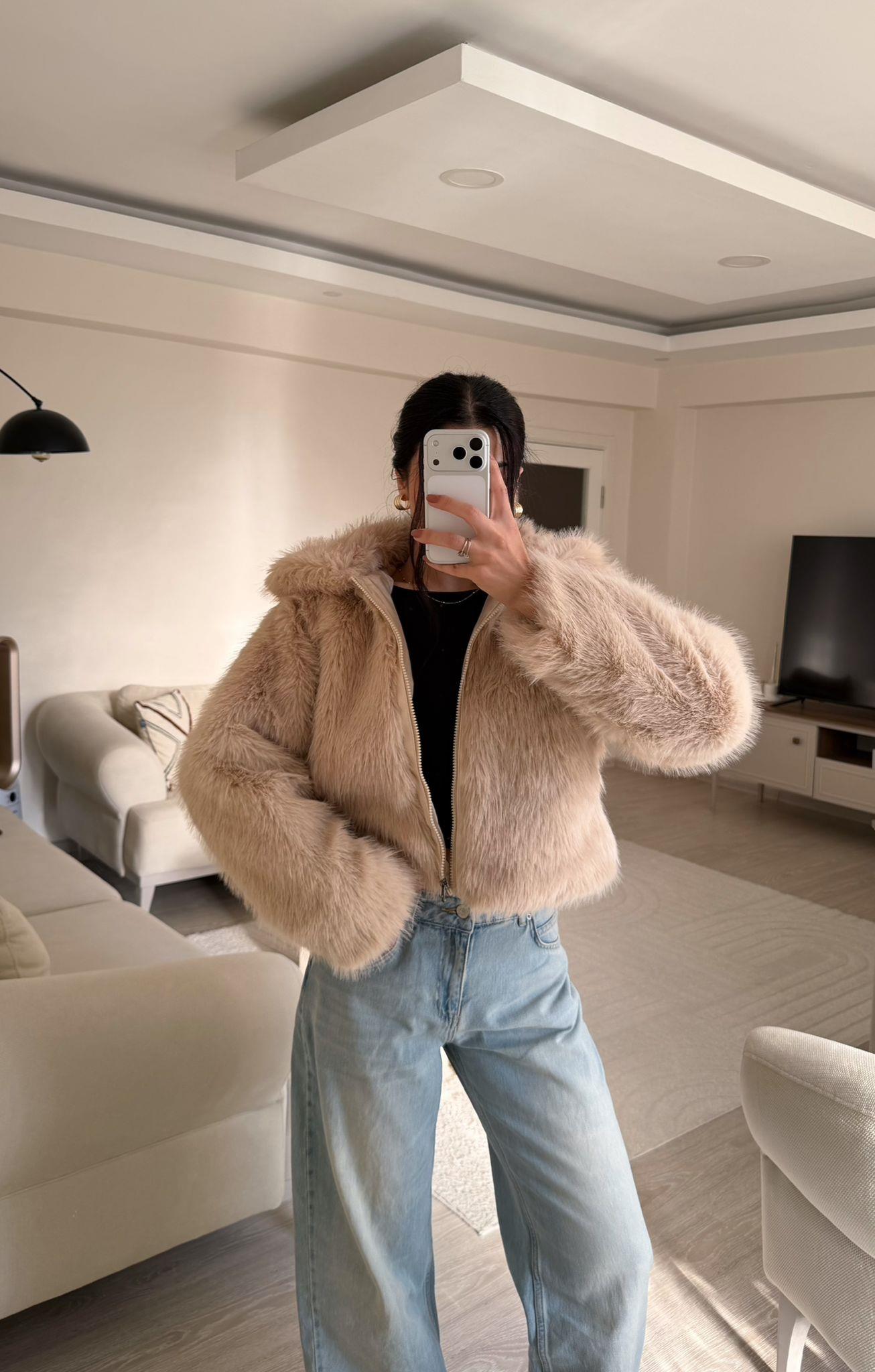 Diane Fermuar Detay Kürk Ceket Krem