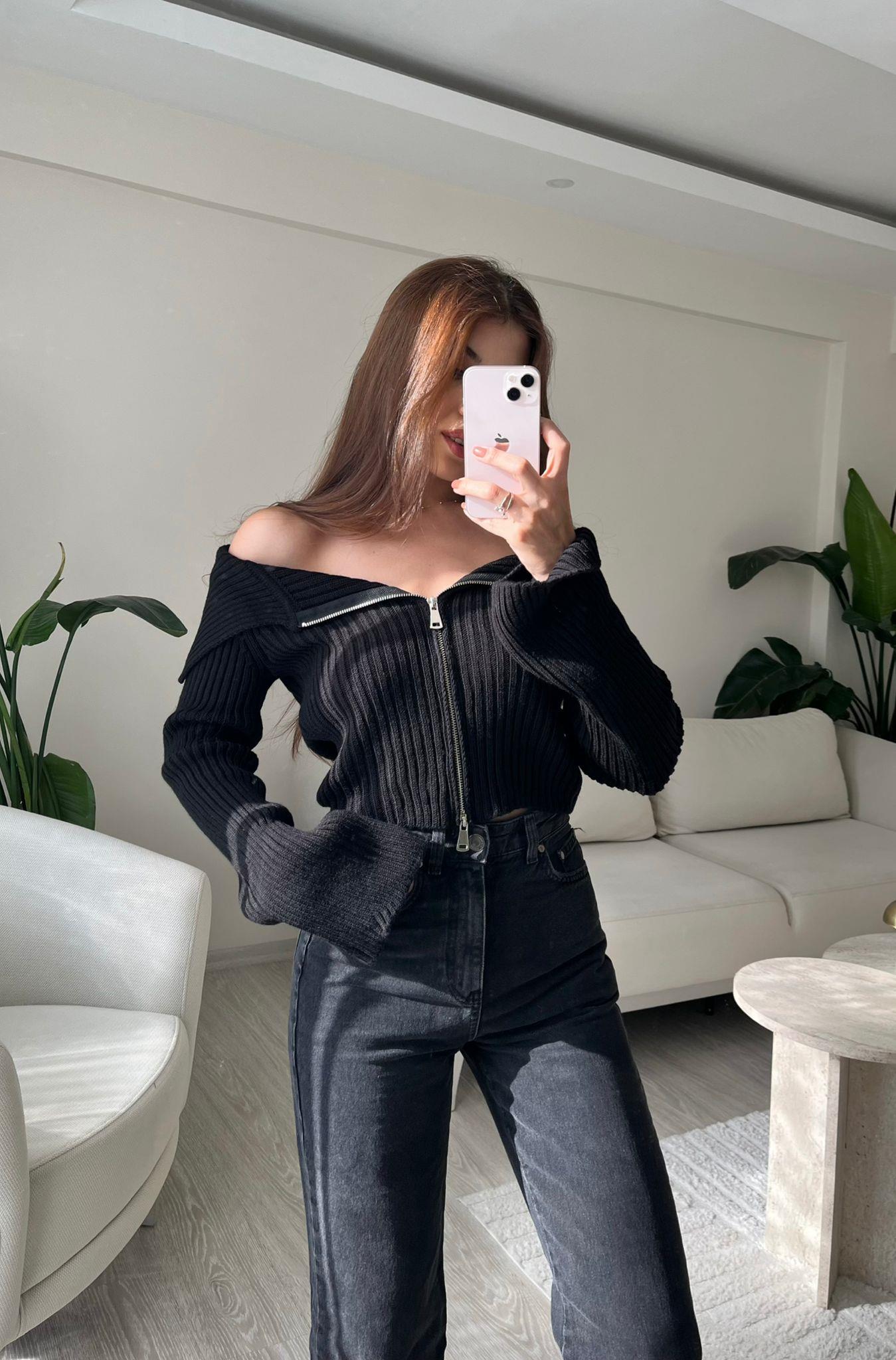 Eva Kayık Yaka Fermuarlı Triko Hırka Siyah