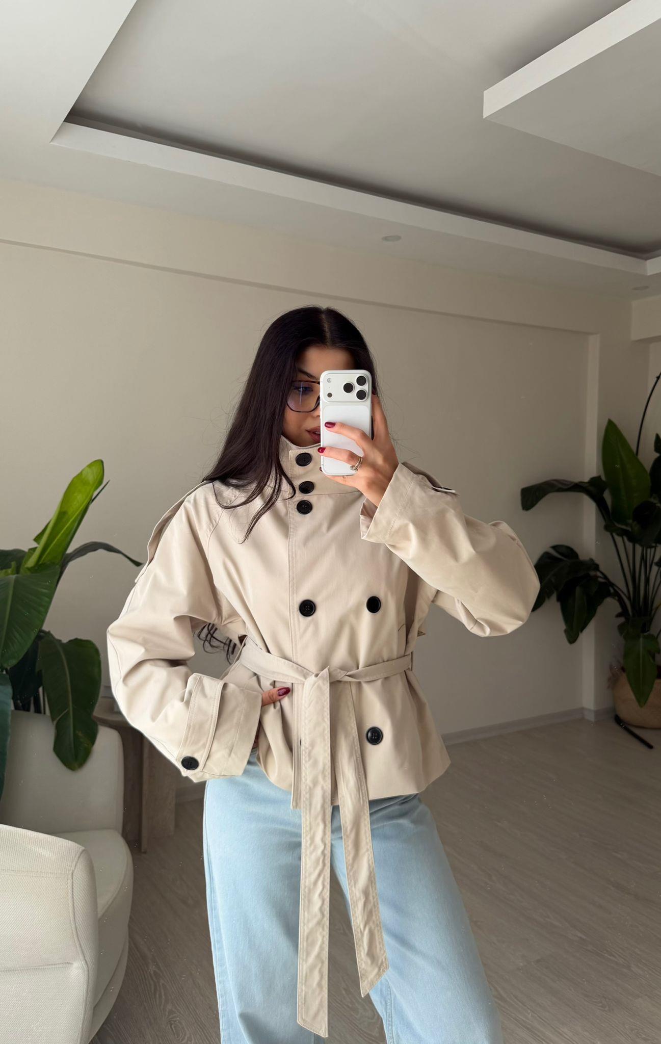 Lea Dik Yaka Kuşaklı Apoletli Kısa Trençkot Taş