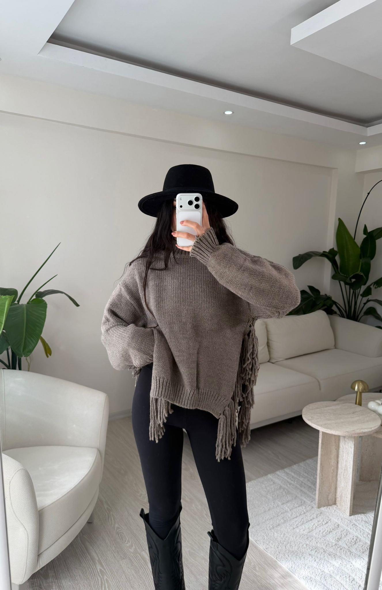 Rodeo Yanları Püsküllü Triko Kazak Vizon